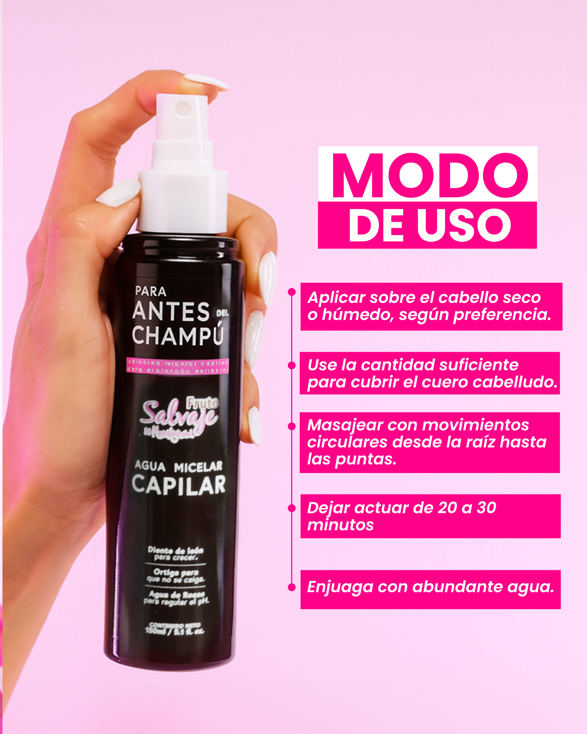 Aplicar en el cabello seco o húmedo según preferencia. Utilizar la cantidad suficiente del producto para cubrir el cuero cabelludo y fibra capilar, masajear con la yema de los dedos realizando movimientos circulares. Dejar actuar 30 minutos antes del lavado con champú FrutoSALVAJE. Si deseas puedes dejarlo aplicado.